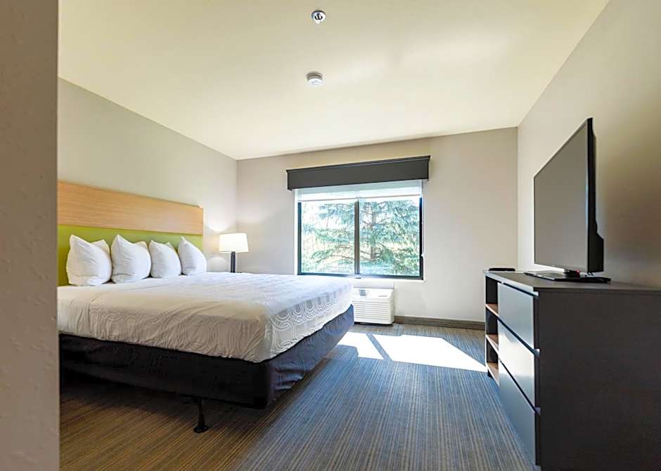 This king room features a tea/coffee maker, microwave, fridge and flat-screen TV.